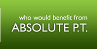 Who would benefit from Absolute Physical Therapy? At Absolute Physical Therapy we provide treatment for patients with acute, chronic, pre, and post operative needs. We frequently treat patients with a variety of pain conditions such as: back, neck, arm, leg, hip, shoulder, knee, elbow, hand, foot, rib, chest, abdominal, pelvic, jaw, head, migraine, fibromyalgia, arthritis, TMJ, neuralgia, repetitive strain, carpal tunnel tendonitis, RSD, tennis elbow, fasciitis, sports injuries, post surgery recovery and more….